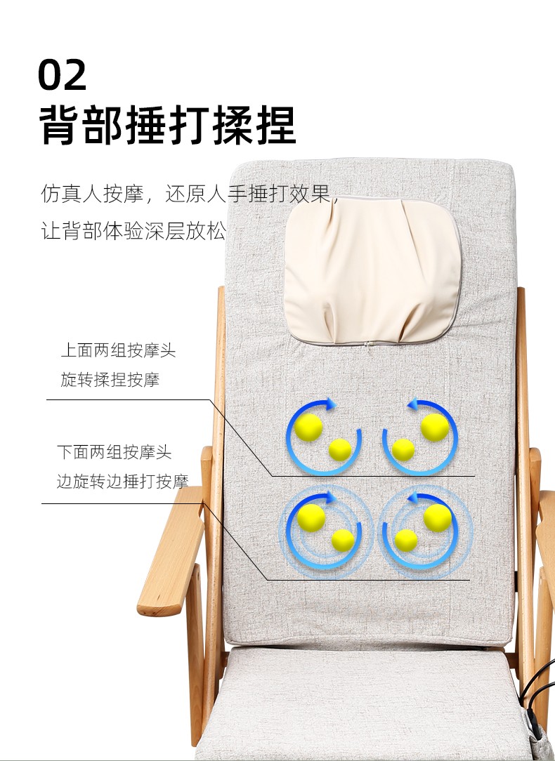 2.背部:上來(lái)來(lái)回按摩,有2組共4個(gè)揉捏按摩頭,有2組2個(gè)敲擊按摩頭。