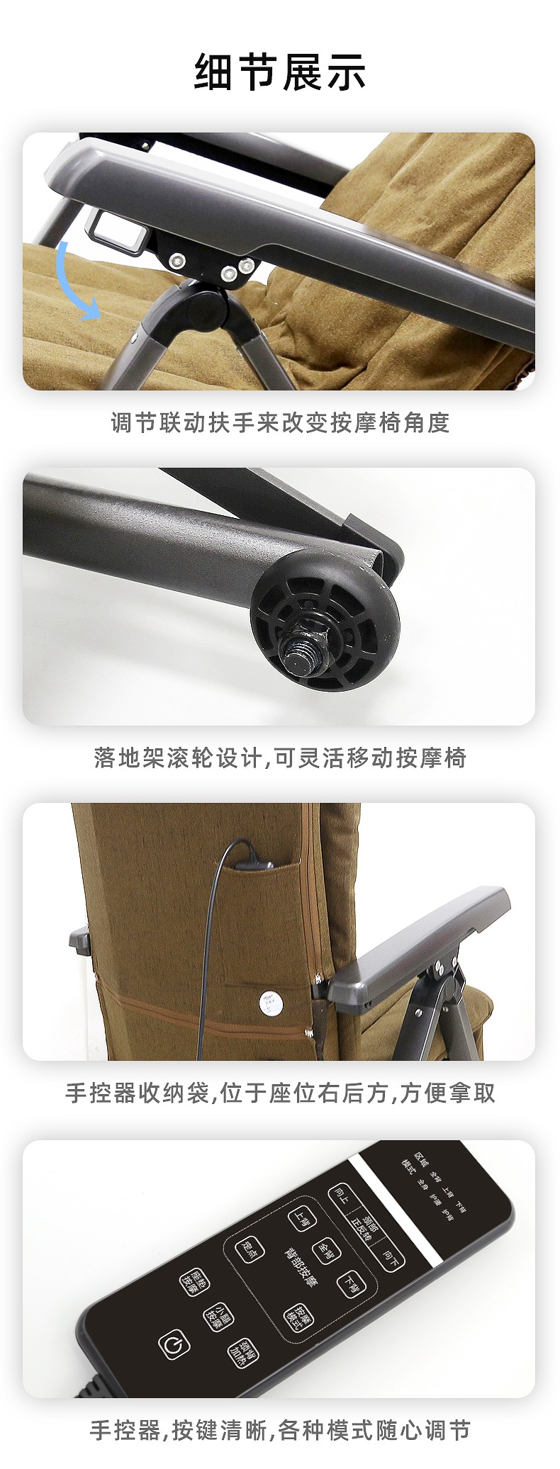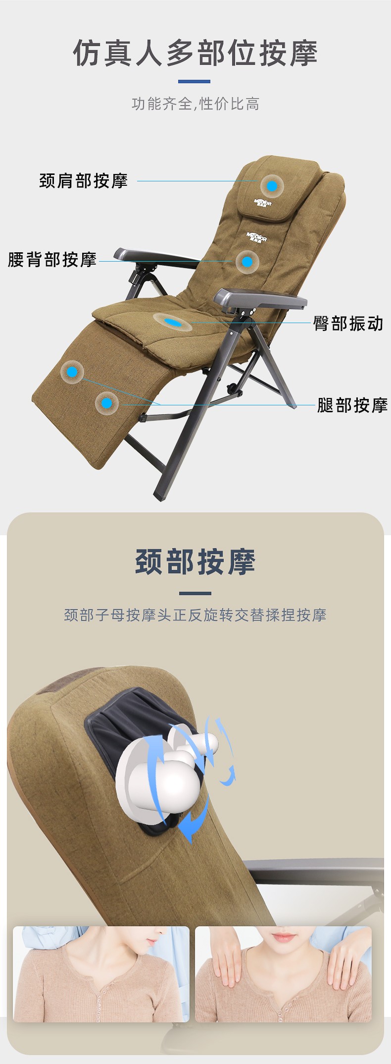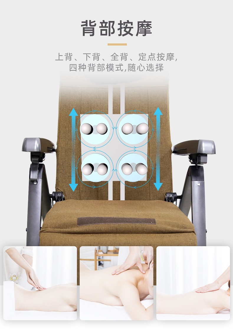 1.頸部:創(chuàng)新壓肩按摩,正反轉(zhuǎn)揉捏,上下可調(diào)節(jié)高矮適應(yīng)不同人。