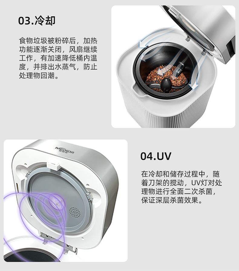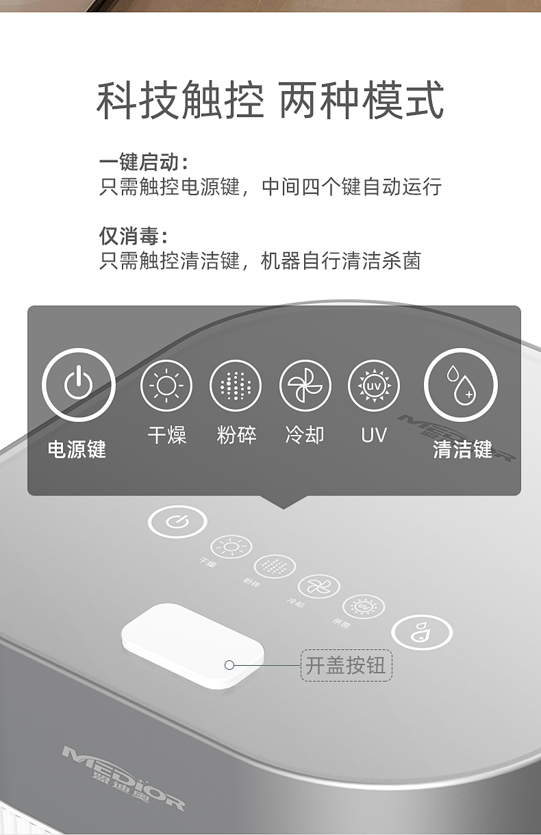 冷卻:研磨模式完成后,自動啟動冷卻模式。 電源按鈕和 干燥,研磨,冷卻燈及 紫外線燈點(diǎn)亮。 您可以在冷卻模式下設(shè)置UV周期。